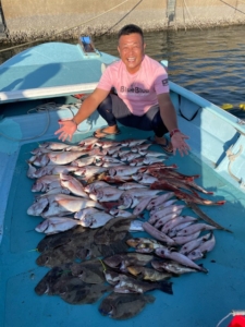いつも安定の青木さんはこの釣果では満足してないみたいです😆今日は鯛が少ないからですかね!それでも数は結構あるので大漁ですよね👍他にもブリゲットで良い笑顔ですね!トラフグはまぁまぁのサイズで、これはお客さんからプレゼントで頂きました😁ありがとうございました😊今日は帰りに風があって操船が大変でしたね。皆さんお疲れ様でした!