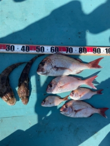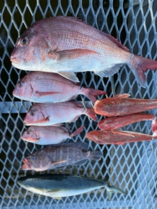 今日の海も青物ボコボコでしたがうちのお客さんはいい所に当たらずイマイチの釣果でしたが、それでも釣れた魚はサイズが良かったですね👍最近タイがイマイチでしたが今日は少し顔が見れたのでまだまだいけそうですね😁アオリイカも1キロオーバー連発でさすが青木さんですね👍