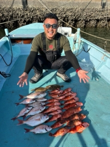 今日はお客さんが無いので自分の釣り行ってきました😊キス狙いで今年は数が少ない話しでしたが、数も釣れたしサイズも良型ばかりで、2時間半の3人(素人2人)にしては結構釣れたと思います😁写真は途中で撮ったやつで最後に撮るのを忘れました😅キスの他にもツノギマ、ゼンメ(ヒイラギ)、クサフグ、メゴチ、ツバスと色々釣れて楽しかったです👍