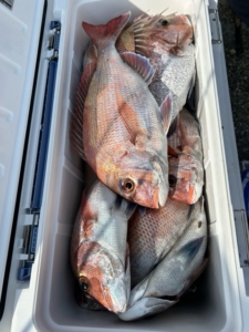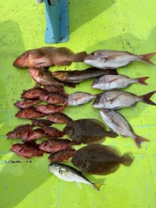 雨が降り続いて海が濁って釣れない情報がありましたが、全然関係なく沢山釣れました。サイズも前回より良型が増えて、写真は3時間の2人分で100匹以上です。でもそれと同じ位チンタが邪魔しますし、コアジも釣れます!ドンドン型が良くなってきてますので楽しめもすよ!
