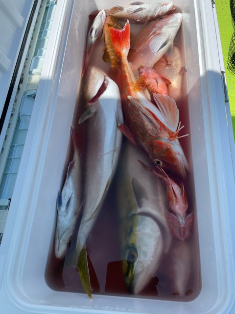 今日も暑い中、昼過ぎまでと短い時間の中でも沢山釣れました。ハマチ、タイ、デカホウボウ、カサゴ、ヒラメ、ハタなど種類も豊富でした。最近釣果結構あるので、次に行く人達も期待出来そうですよ👍