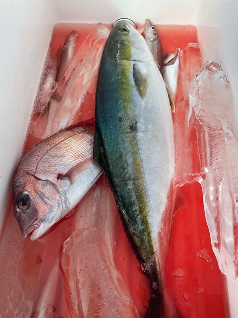 今日は台風明けて初日で波も残っててどうかなと思いましたが、やっぱりまだ調子がいい感じで釣れますね!真鯛に青物、夏に旬なスズキにとバッチリ釣れました。 -