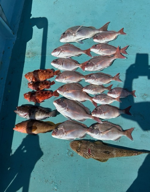 最近釣果ぎイマイチの中、今日はメジナが爆釣して、久しぶりに大漁の船があったり、鯛もそこそこ数が上がって良かったと思います😊最近は周りの船でもちょくちょく上がっていて、上向き傾向になってきているので、ようやく春らしくなってきました😁 -