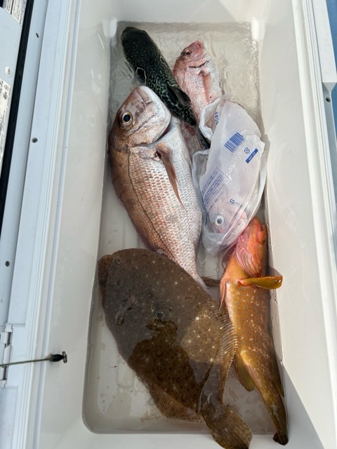 今日も朝一から絶好調で定番のマダイに始まりキジハタ、青物、大アジ、ホウボウ、カサゴ、ヒラメ、コチ、ニベ、キス、ツノギマ、後珍しく高級な白アマダイなど魚種が豊富に釣れました😄