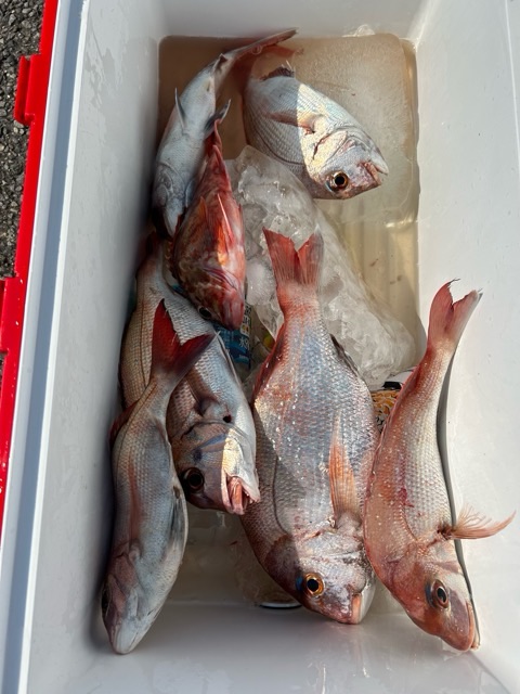 今日もタイラバが絶好調でタイの他にも底物など爆釣でした😁写真は一部ですが皆さん全員が自分のクーラーボックスに魚が入ってまして写真が撮りきれませんでした😭今日はバッチリでしたね👍暑い中お疲れ様でした😁 -