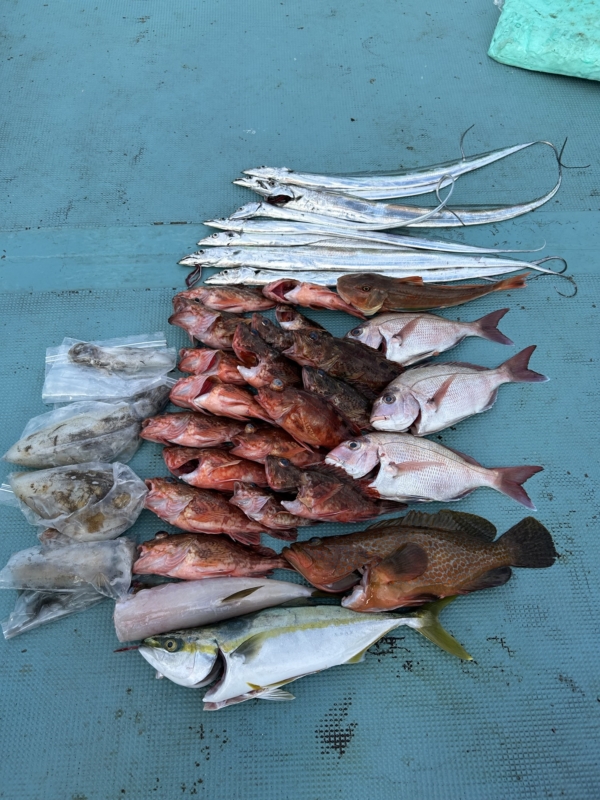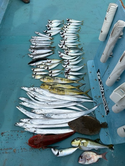 今日もタイラバの釣果は結構良かったですが、アオリイカ狙いの船は厳しかったですね〜😅魚種は真鯛、アジ、サバ、サゴシ、ホウボウ、ガンゾウ、サバフグ、シイラ、カマス、タチウオ、カサゴ、ツバス、コチ、でした! 輝王丸⬆️ 第四大宏丸⬆️ -