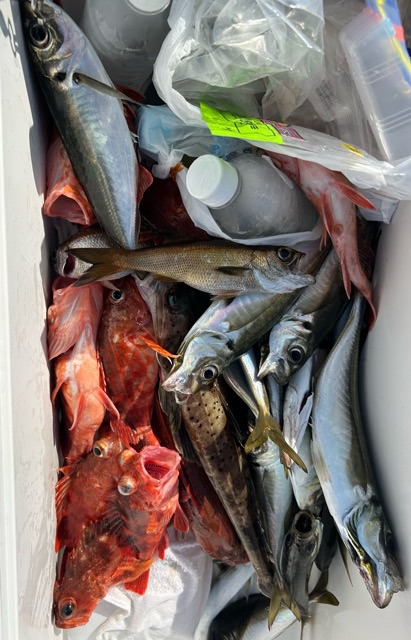 8月30日の釣果!今日は暑かったですが頑張って釣って来てくれました😅今日は久しぶりにアジの群れに遭遇し良いサイズのアジが沢山釣れました。他にも大きなホウボウにツバス、真鯛、カサゴ、イネゴチが釣れてました😊